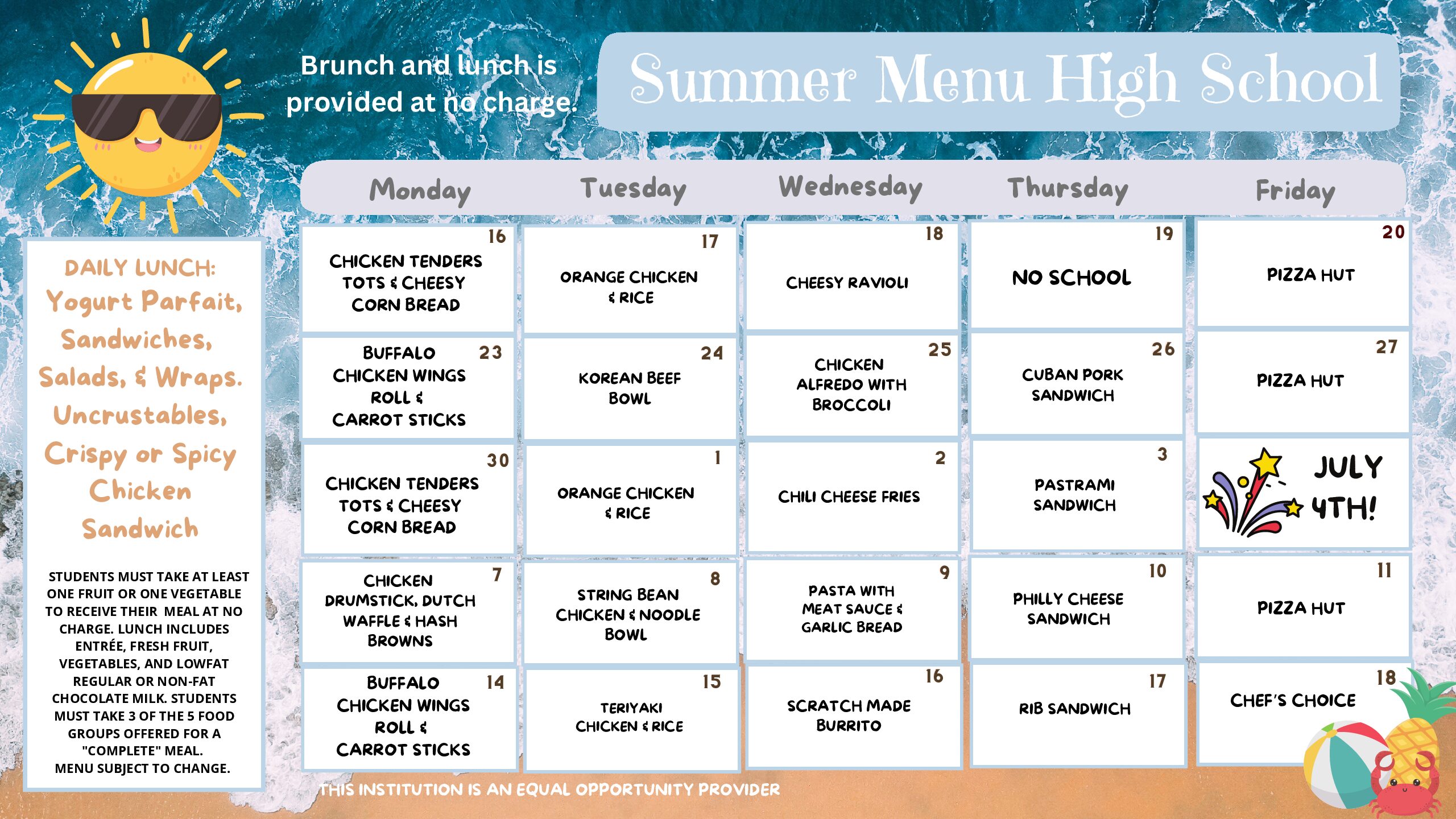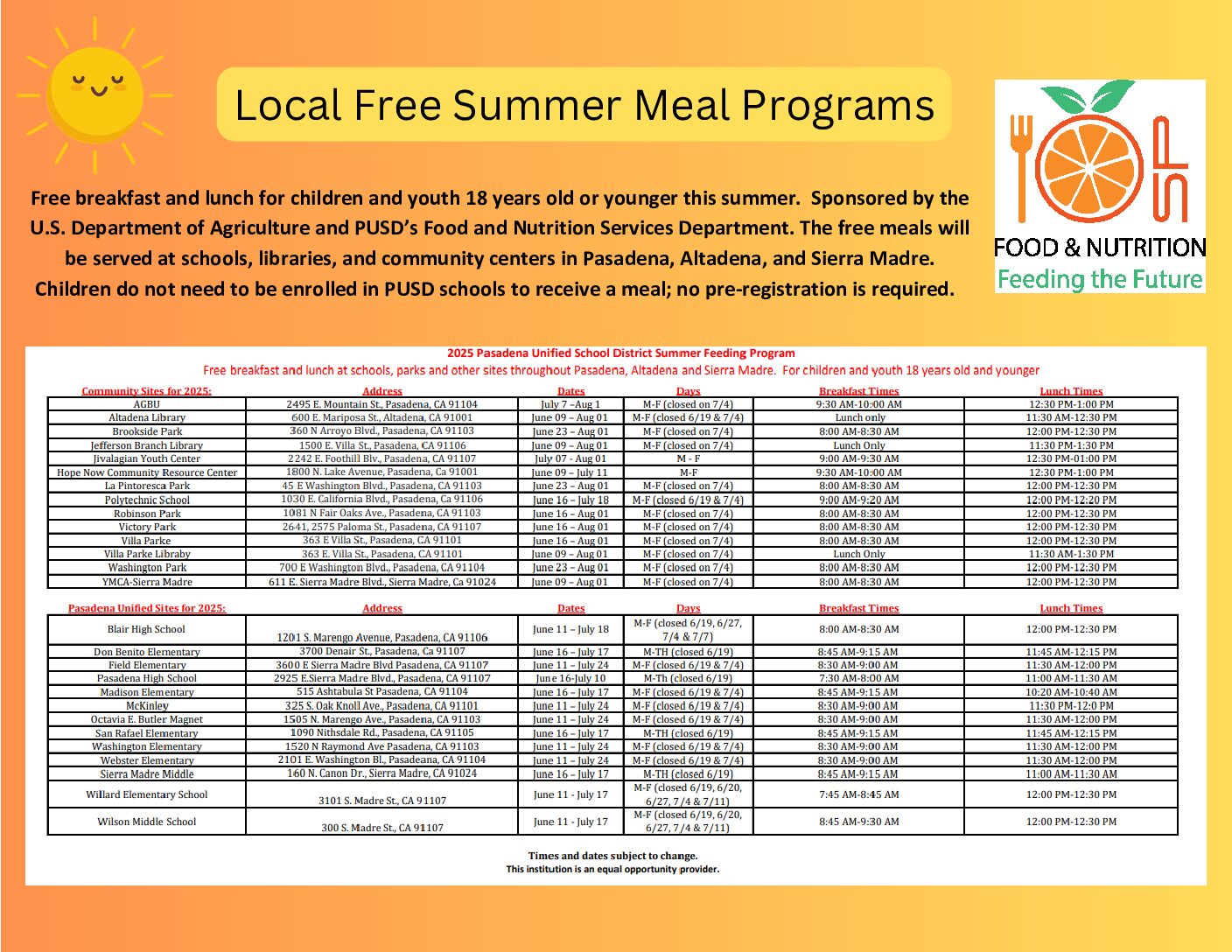 - High School: Under the Universal meals program through the State of California and in accordance with the CDE guidelines, schools offering academic credit courses must offer breakfast and lunch at no charge. Meals will be free of charge at the High School only. Breakfast will be offered from 7:50am-8:10am. Lunch will be offered at 11:00am. A la carte smart snack items are offered at an additional charge.