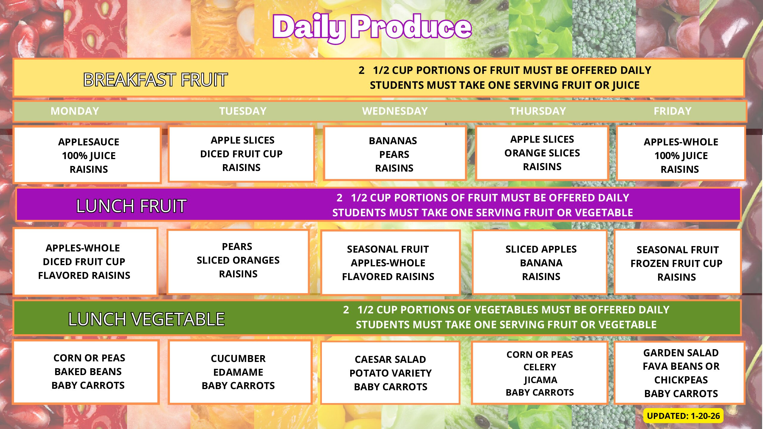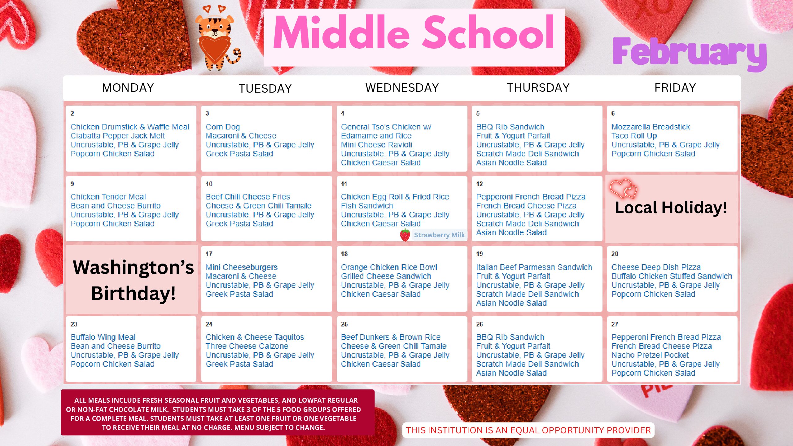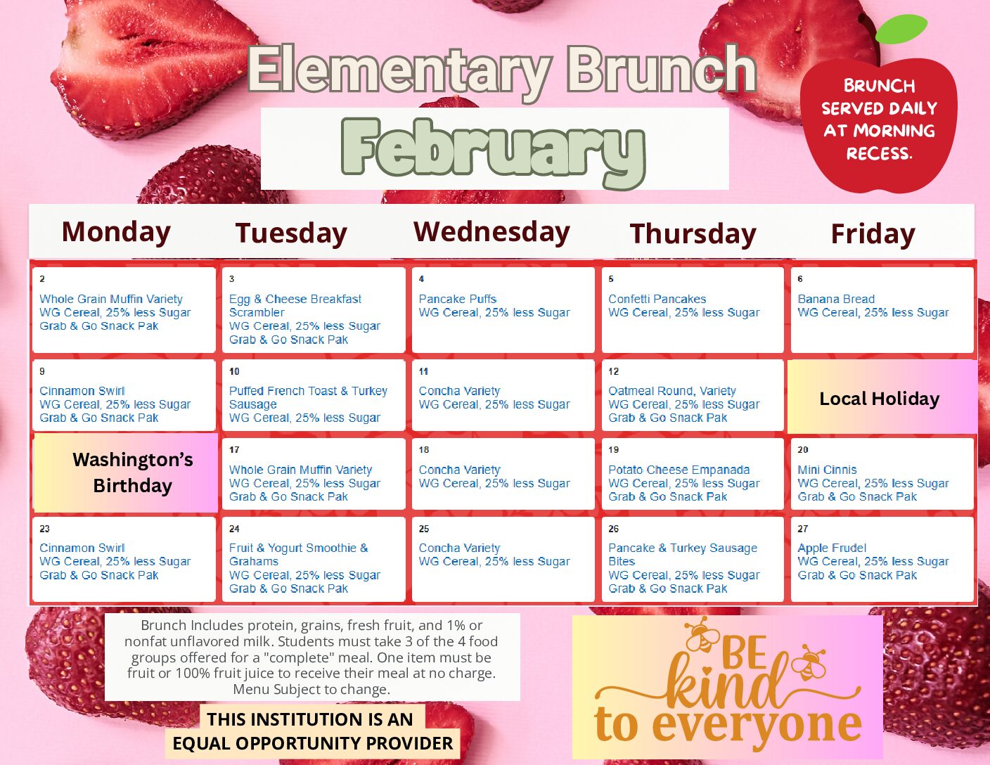 Getting kids to eat healthy is our #1 Job! We work hard to build menus that meet all the standards of the USDA School meal programs. We believe that we can combine well balanced nutrition with tasty foods that your child will want to eat. We take pride in presenting a variety of choices for every taste and many dietary needs. A healthy body supports healthy learning and we are dedicated to building strong minds and strong bodies!